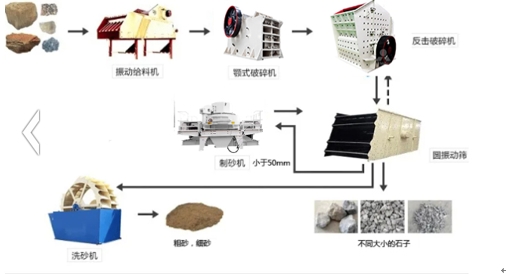 一、顎式破碎機+反擊式破碎+振動篩配合使用。這是一條比較常見的配置生產線,主要針對抗壓強度在360 MPa以下的材料,如石灰石、青石、混凝土砌塊、大理石等。成品粒徑可達5mm左右,具有定型功能,可直接篩選出12/13/24規格的成品。